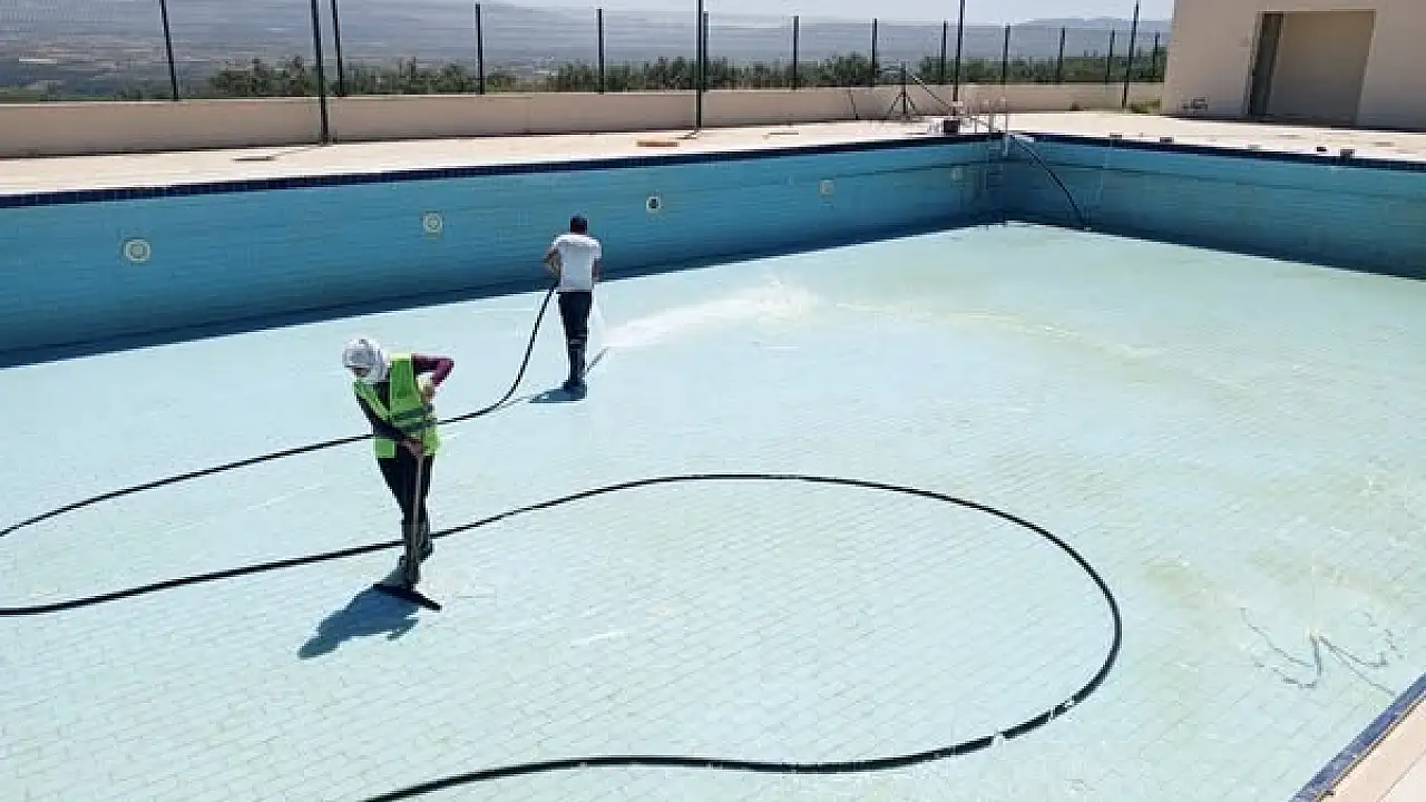 Aydın'ın Karacasu ilçesinde bulunan yüzme havuzunda sezona hazırlık kapsamında temizlik ve bakım çalışması yapıldı.