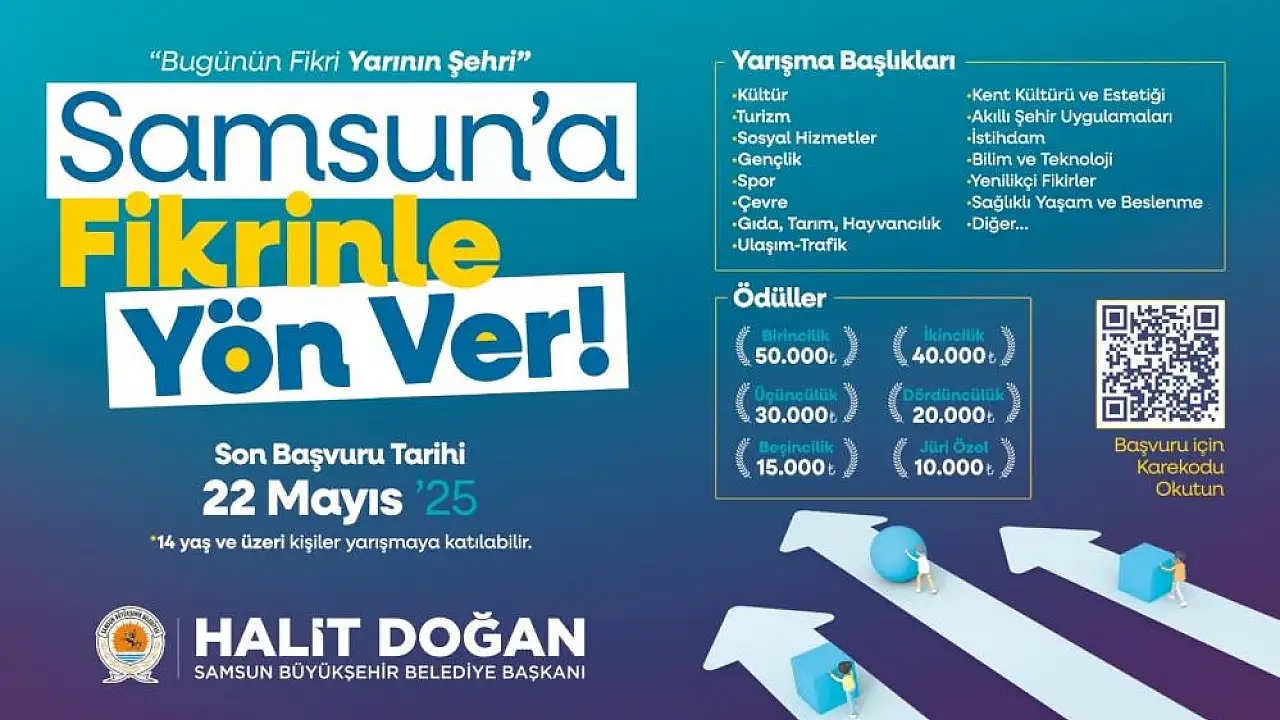 ‘Bugünün Fikri Yarının Şehri’ mottosu ile düzenlenen "Samsun’a Fikrinle Yön Ver" yarışması için kültür, turizm, gençlik, spor, sosyal hizmetler, çevre, ulaşım, trafik, akıllı şehir uygulamaları, istihdam, gıda-tarım-hayvancılık, bilim, sağlık, kent kültürü, kent estetiği gibi ana başlıklar belirlendi. Son başvuru tarihi 22 Mayıs olan yarışmada birinci olana 50 bin TL, ikinciye 40 bin TL, üçüncüye 30 bin TL, dördüncüye 20 bin TL, beşinciye 15 bin TL ödül verilecek. Yarışmanın jüri özel ödülü ise 10 bin TL olarak belirlendi. 14 yaş ve üzeri kişilerin katılımına açık olan yarışmada, başvurular bireysel olarak yapılacak. Bir katılımcı en fazla 3 farklı proje başvurusunda bulunabilecek. Yarışma için başvurular Samsun Büyükşehir Belediyesi’nin resmi internet sitesinden samsunafikrinleyonver.samsun.bel.tr linki üzerinden yapılabilecek.