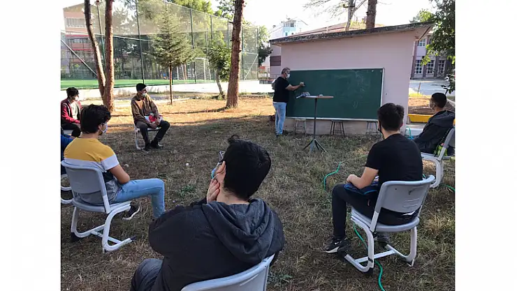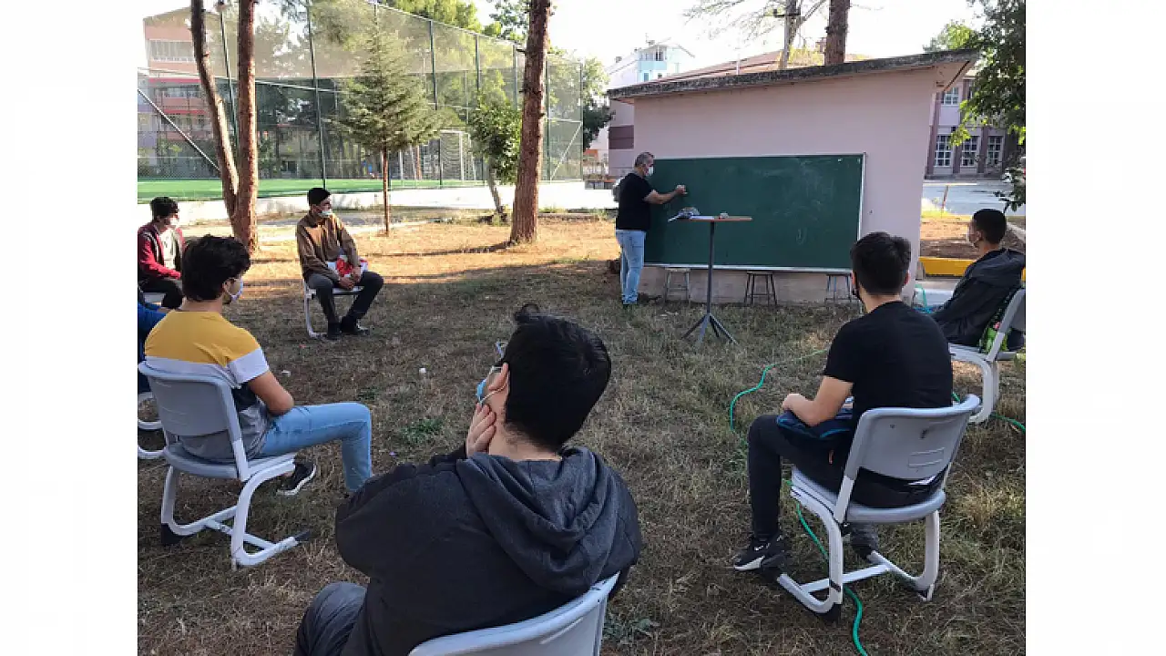 Okulun matematik öğretmeni Tanju Altun tarafından 12. sınıf öğrencilerine matematik dersi pandemi nedeniyle okulun bahçesinde oluşturulan açık hava sınıfında işleniyor. Bahçeye yerleştirilen sandalyelere fiziksel mesafeyi koruyarak oturan öğrenciler eğitimlerine devam ediyor.