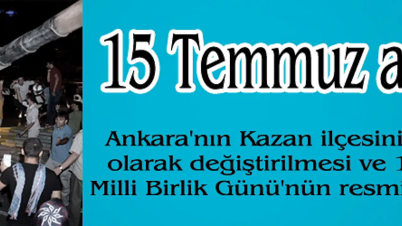 TBMM Genel Kurulu’nda Ankara ili Kazan ilçesinin adının Kahramankazan olarak değiştirilmesi ve Ulusal Bayram ve Genel Tatiller Hakkında kanunda değişiklik yapılmasına dair kanun teklifi görüşmeleri yapıldı. Kazan ilçesinin adının Kahramankazan olarak değiştirilmesi ve 15 Temmuz Demokrasi ve Milli Birlik Günü'nün resmi tatil yapılması kabul edildi.