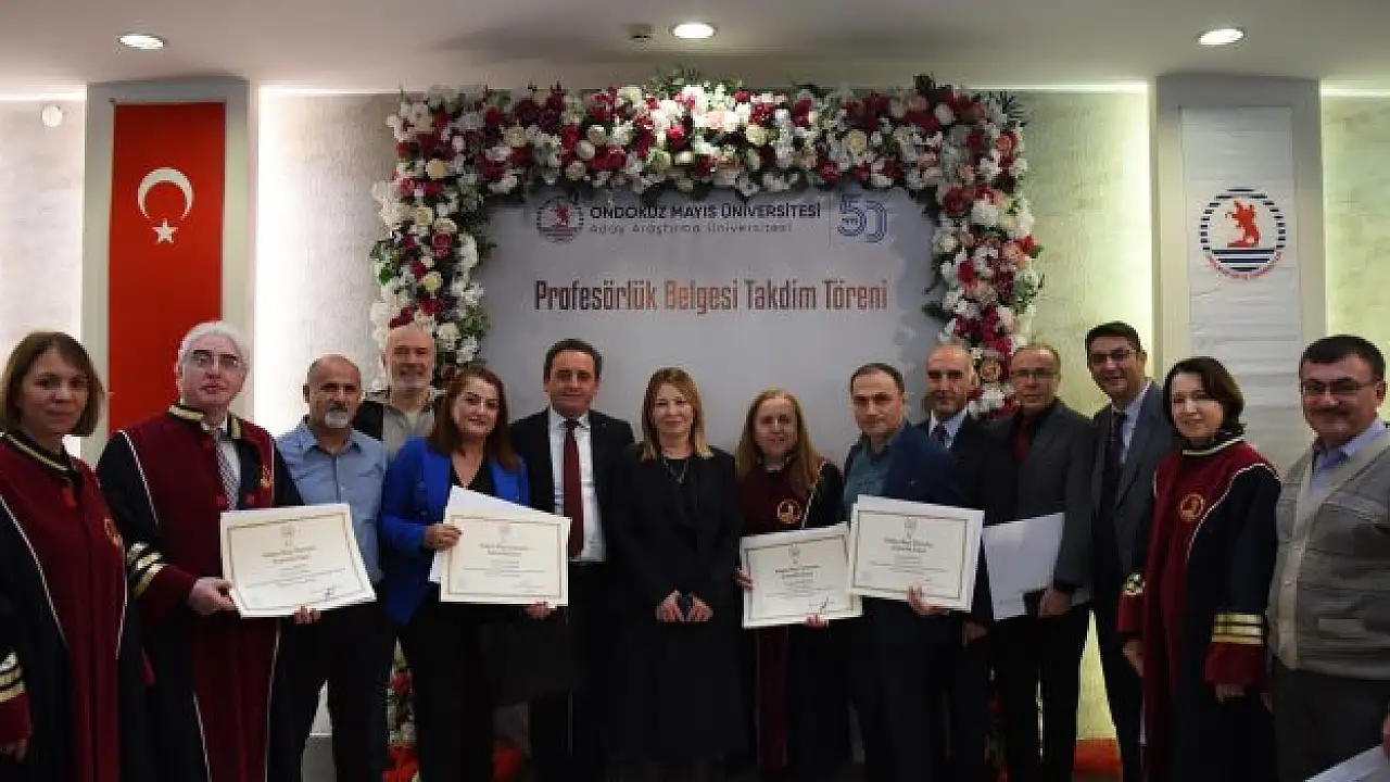 Ondokuz Mayıs Üniversitesi'nde daha önce profesör ünvanı alan ve belgesini teslim almamış akademisyenlere düzenlen sade bir törenle “profesörlük belgeleri” takdim edildi. Rektör Prof. Dr. Fatma Aydın'ın ev sahipliğindeki davete profesörler yoğun ilgi gösterdi. Rektörlük binası fuaye alanında düzenlenen ve 155 profesörün belgesini teslim aldığı etkinlikte Rektör Prof. Dr. Fatma Aydın, akademisyenleri tebrik etti.