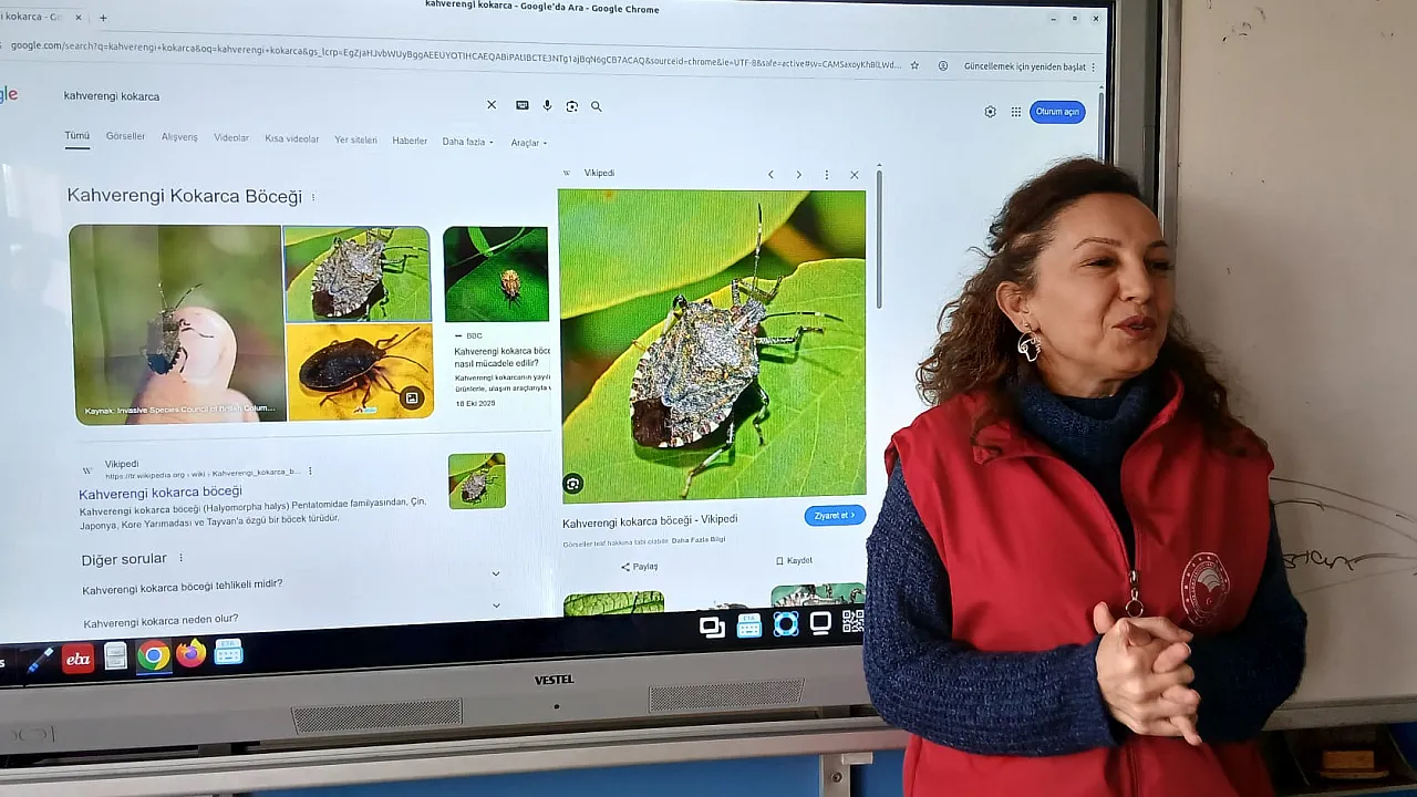 İlçe Tarım ve Orman Müdürlüğü personeli tarafından yapılan sunumlarda, kahverengi kokarca zararlısının tarım üzerindeki etkileri ele alınarak, bu zararlıya karşı alınabilecek önlemler öğrencilere aktarıldı.