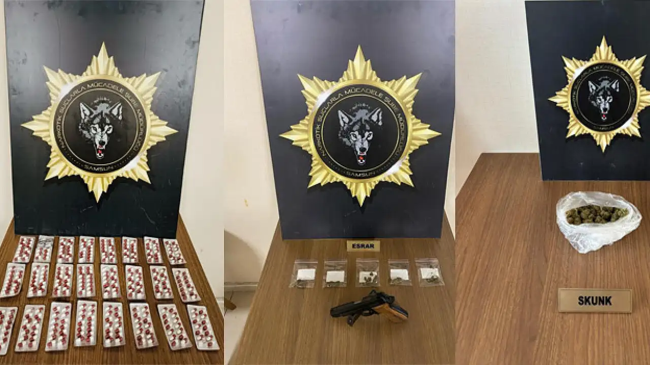 Samsun'da 31 gram bonzai (sentetik kannabinoid), 19,95 gram esrar, 7,56 gram metamfetamin, 2 adet ecstasy, 2 adet esrarlı sigara, 3 adet uyuşturucu kullanımına yarar aparat, 2 adet ruhsatsız tabanca ve 31 kişi yakalandı
