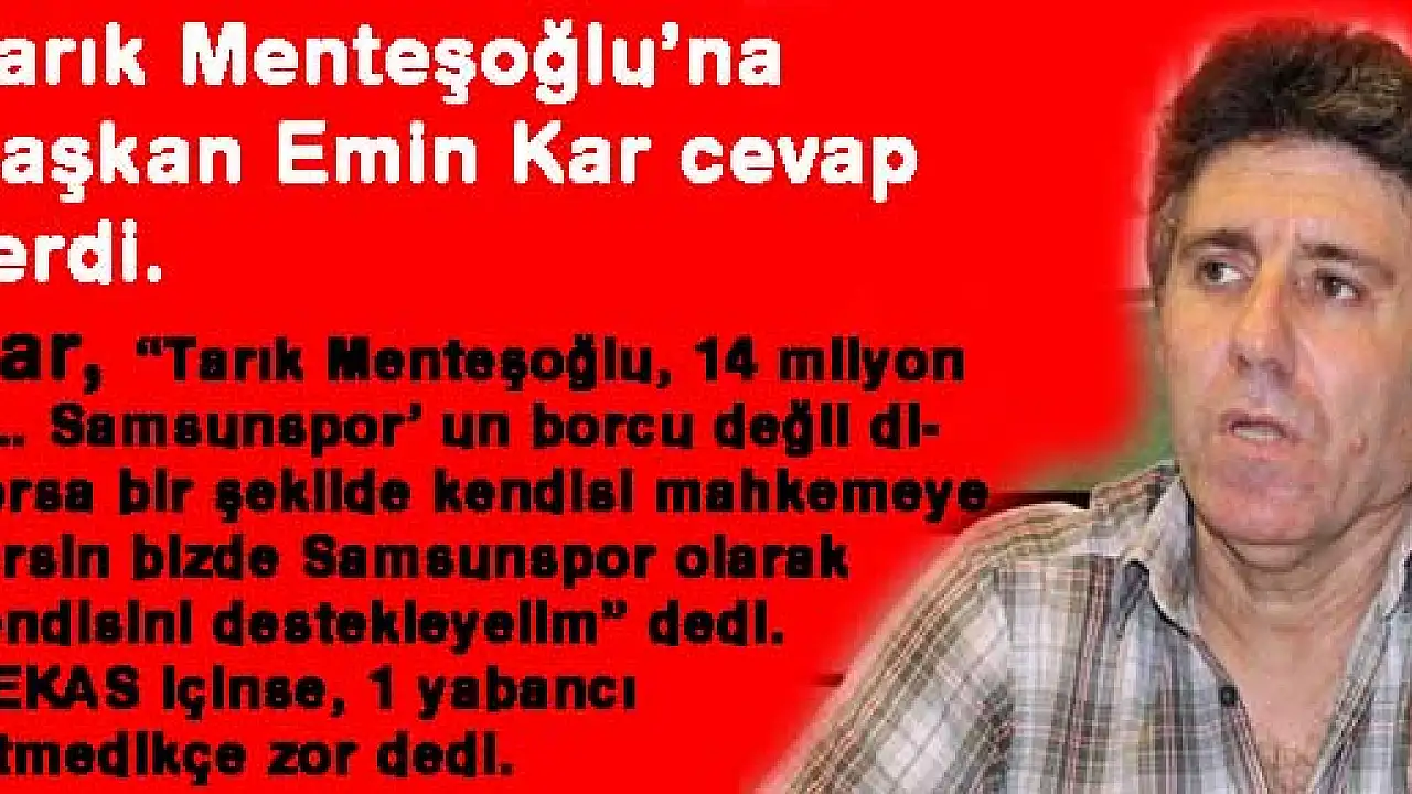 Gazetemize çarpıcı açıklamalarda bulunan Tarık Menteşoğlu'na Samsunspor Başkanı Emin Kar cevap verdi. Kar, 'Tarık Menteşoğlu, 14 milyon TL. Samsunspor' un borcu değil diyorsa bir şekilde kendisi mahkemeye versin bizde Samsunspor olarak kendisini destekley
