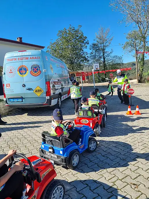 Jandarma personeli, öğrencilere trafik kuralları hakkında bilgi verdi. Öğrenciler, akülü arabalarla oluşturulan parkurda trafik kurallarını uygulamalı olarak öğrenme fırsatı buldu.