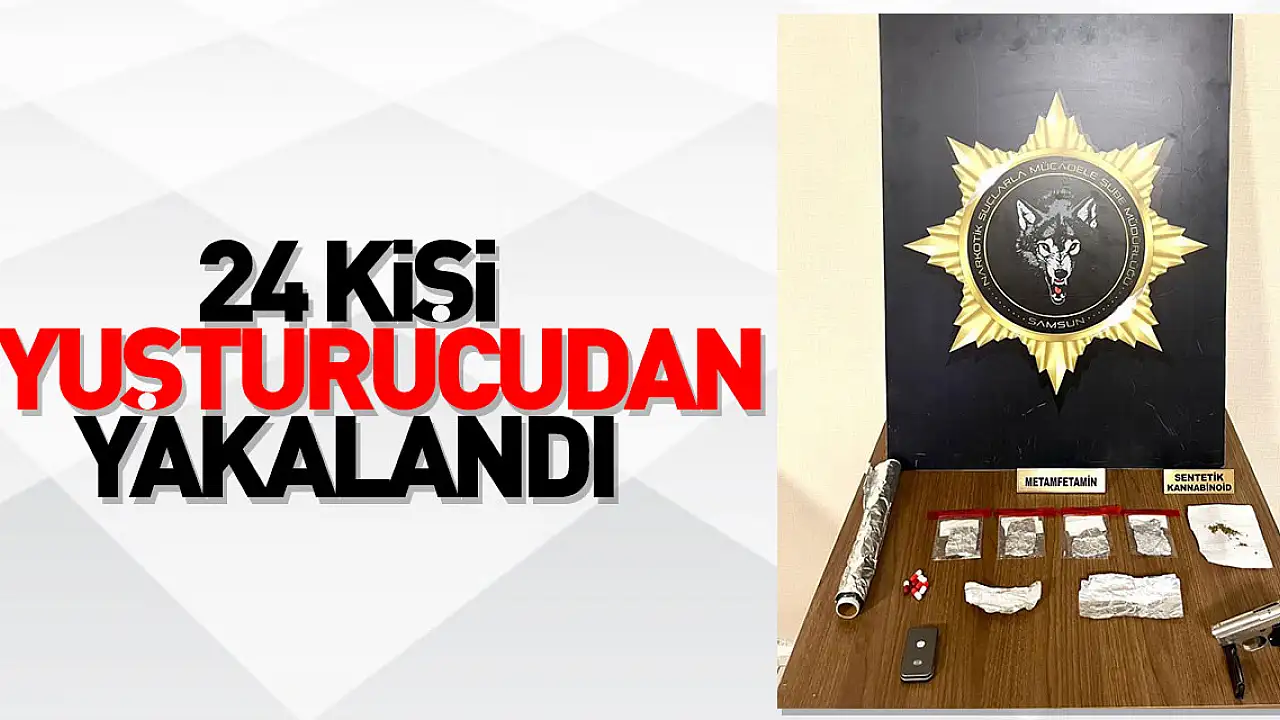 Samsun Cumhuriyet Başsavcılığı koordinesinde uyuşturucu ile mücadele çalışmalarını sürdüren Samsun Emniyet Müdürlüğü Narkotik Suçlarla Mücadele Şube Müdürlüğü ekipleri, ilçe emniyet ve şube müdürlüklerinin de desteğiyle yapılan uygulamada 36 gram skunk, 42 adet sentetik ecza, 5,71 gram metamfetamin, 2,20 gram esrar, 0,76 gram kokain, 0,50 sentetik kannabinoid, 2 adet esrarlı sigara, 1 adet hassas terazi, 2 adet uyuşturucu madde kullanımına yarar aparat, 2 adet ruhsatsız tabanca ve 5 ruhsatsız tabanca fişeği ele geçirdi. Uyuşturucu madde kullanmak suçundan 4 yıl 2 ay kesinleşmiş hapis cezası bulunan 1 kişi, ruhsatsız ateşli silahlarla mermiler satın alma suçundan 6 ay hapis cezası bulunan 1 kişi ve hırsızlık suçundan ifadeye yönelik aranması olan 1 şahıs ile birlikte toplam 24 kişi yakalandı.