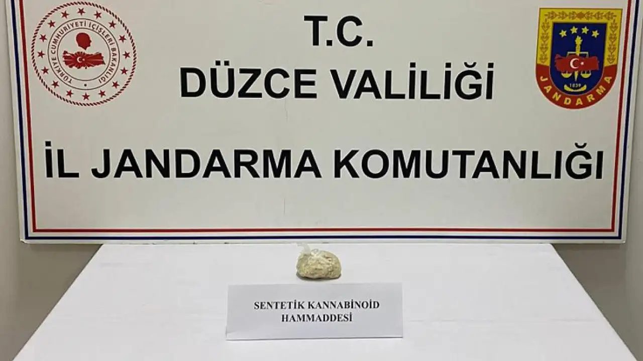 Düzce'de Jandarma ekiplerinin uyuşturucu ile mücadelesi sürüyor. Kaynaşlı ilçesi, Anadolu Otoyolu üzerinde Düzce Cumhuriyet Başsavcılığı koordinesinde Jandarma Narkotik Suçlarla Mücadele Şube Müdürlüğü ve uyuşturucu madde arama köpek unsuru ile birlikte yol kontrol faaliyetinde bulundu. Kontrol noktasında durdurulan araçta yolcu olarak bulunan U.K.K. (26) isimli şahsın yapılan kaba üst aramasında piyasa değeri yaklaşık 3 milyon TL olan uyuşturucu yapımında kullanılan 100 gram ağırlığında sentetik kannabinoid hammaddesi tespit edildi.