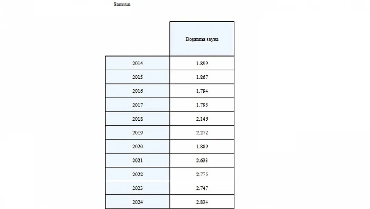 Samsun'da boşanma vakalarında son yıllarda artış yaşanıyor. Türkiye İstatistik Kurumu (TÜİK) verilerine göre 2021 yılında 2 bin 633 olan boşanma sayısı, 2024 yılında 2 bin 834'e yükselerek 4 yılda yüzde 7,6 yükseldi