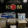 Şüphelilerin evi ve aracında yapılan aramada, 56 bin 100 dolu makaron, 65 kilogram bandrolsüz kıyılmış tütün, 281 paket kaçak sigara ve 15 elektronik sigara ele geçirildi.