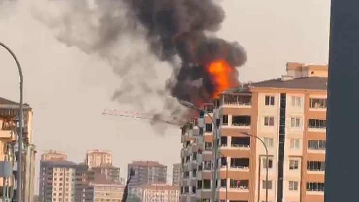 Gaziantep'te 7 katlı bir binanın çatısı alev alev yandı.