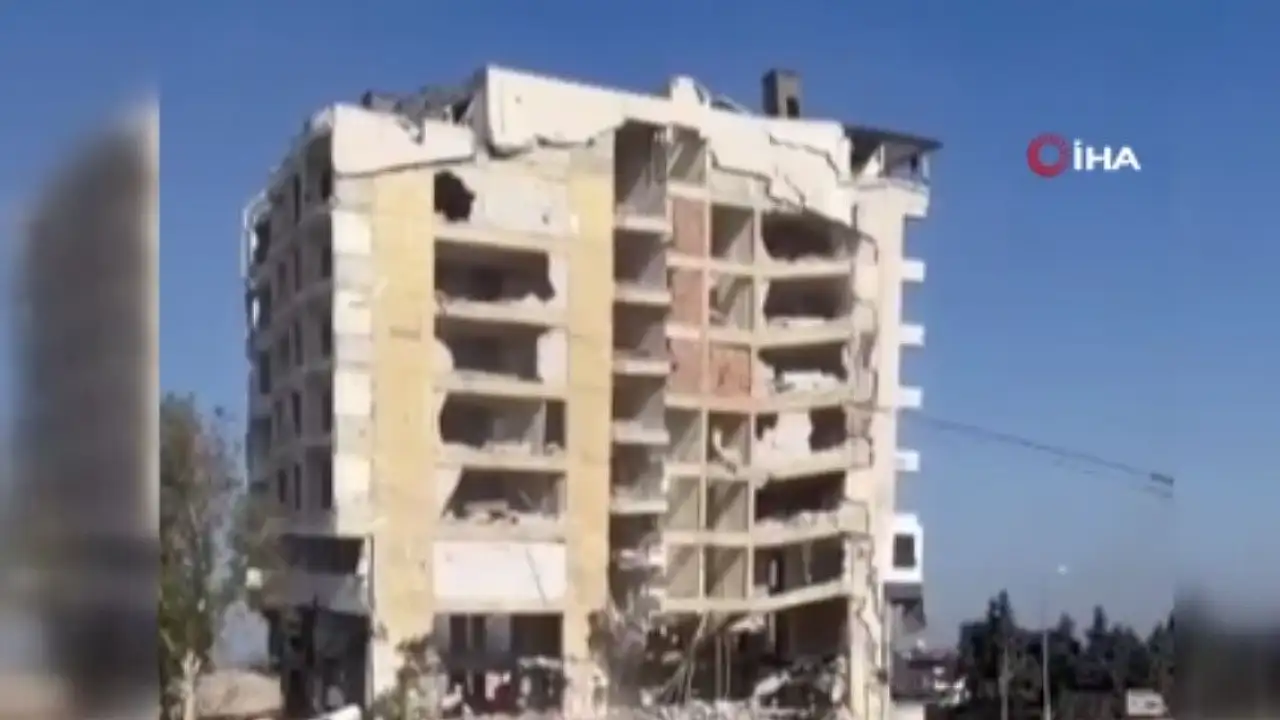 Hatay'ın depremde hasar alan bina halatla çekilerek yıkıldı, o anlar cep telefonu kamerasına yansıdı.
