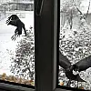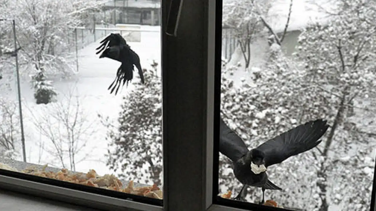 Cam kenarına bırakılan pilav ve ekmek kırıntıları için gelen kargaların ise adeta birbiriyle yarışması gözlerden kaçmadı.