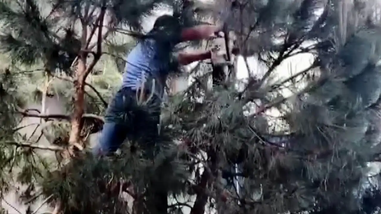 Davut isimli bir mahalle sakini çam ağacının tepesine çıkarak kediyi oradan kurtarmaya çalıştı. Kediyi tutmaya çalışan vatandaş, 10 dakikalık çabanın ardından ağaçtan inemeyen kediyi ensesinden tutarak, aşağı indirdi.