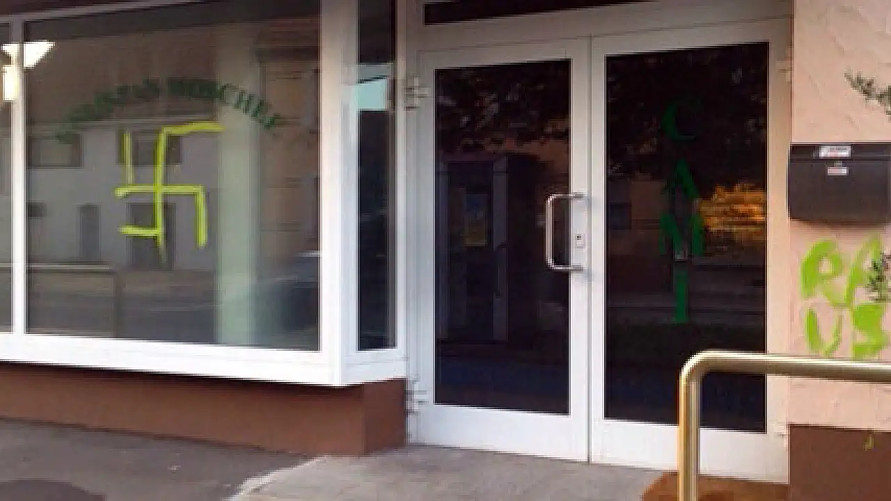 Almanya'da Baden-Württemberg eyaletinde bulunan bir caminin duvarlarına, camlarıma ve cami önündeki yaya yoluna gamalı haç çizilerek ve 'Dışarı' yazıldı.