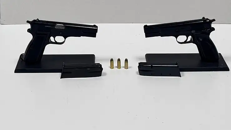 Araçta yapılan aramada, yedek lastiğe gizlenmiş 2 ruhsatsız tabanca, 3 tabanca fişeği ve 2 şarjör ele geçirildi.