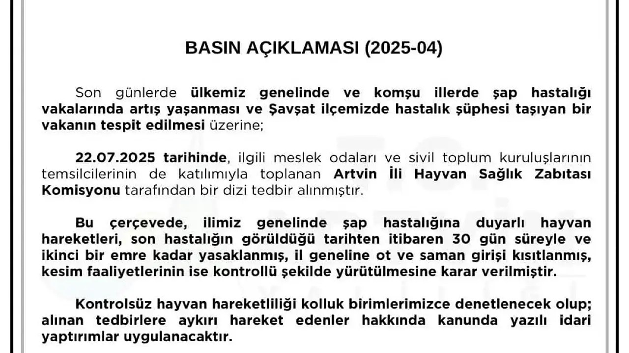 Artvin’de şap hastalığının yayılmasını önlemek amacıyla Artvin İli Hayvan Sağlık Zabıtası Komisyonu tarafından yeni tedbirler alındı. 22 Temmuz 2025 tarihinde toplanan komisyon, hastalığın görüldüğü andan itibaren il genelinde hayvan hareketlerinin 30 gün süreyle ve ikinci bir emre kadar yasaklandığını duyurdu.