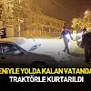 Gece saatlerinde evine gitmek isteyen bir vatandaş, kullandığı aracın kara saplanması sonucu yolda mahsur kaldı. Yoğun kar nedeniyle ilerleyemeyen sürücü, kendi imkanlarıyla kurtulamayınca yardım istedi.