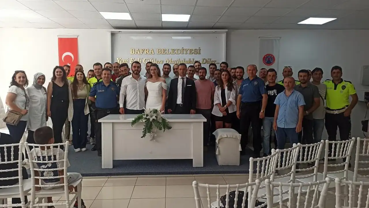 İlçe Emniyet Müdürlüğü Asayiş Büro Amiri Komiser Tugay Önerbay ile İlçe Emniyet Müdürlüğü Güven Masasında görevli Nermin Tezgel, Bafra Belediyesi Nikâh Salonunda düzenlenen törenle evliliğe ilk adımı attı. Törene İlçe Emniyet Müdürü Öner Bahçekapılı, İlçe Emniyet Müdür Yardımcısı Murat Öner, mesai arkadaşları ile Önerbay ve Tezgel aileleri katıldı.