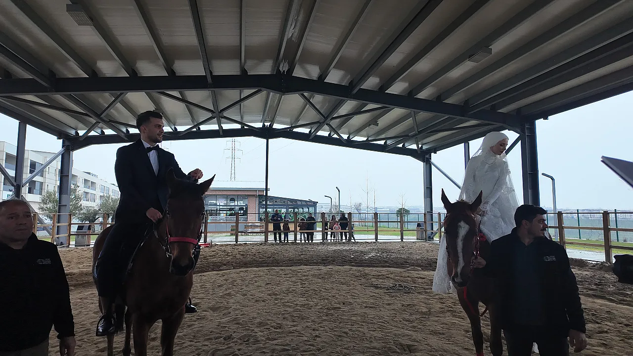 At binicilik tesisinde tanışan genç çift, hayatlarını birleştirme kararını sıra dışı bir nikah töreniyle gerçekleştirdi. genç çift, nikahı at üzerinde kıyarak unutulmaz bir an yaşadı.