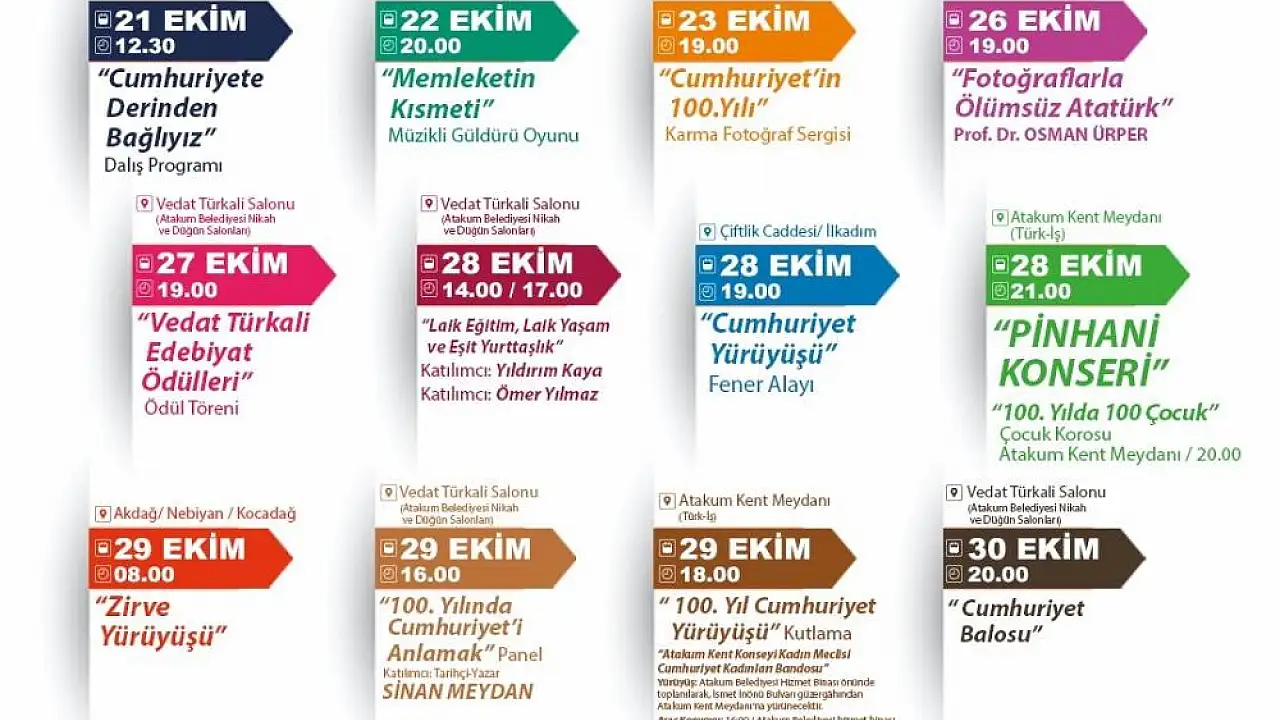 Marmara Üniversitesi Güzel Sanatlar Fakültesi Öğretim Üyesi Prof. Dr. Osman Ürper, seçkilerinden oluşan ‘Fotoğraflarla Ölümsüz Atatürk’ başlıklı konferansta, vatandaşlara tarihten kareler sunacak. Program Atakum Belediyesi Nikah ve Düğün Salonları, Vedat Türkali Salonu’nda 26 Ekim Perşembe günü saat 19.00’da başlayacak. ‘3. Vedat Türkali Edebiyat Ödülleri’ni kazanan eser sahipleri; 27 Ekim Cuma günü saat 19.00’da, Vedat Türkali Salonu’nda düzenlenecek törenle ödüllerini alacak. 28 Ekim Cumartesi günü saat 14.00’te yine Vedat Türkali Salonu’nda gerçekleştirilecek programda, Eski TBMM Üyesi ve Eğitimci Yıldırım Kaya ile Öğrenci Veli Derneği (Veli-Der) Genel Başkanı Ömer Yılmaz’ın katılımıyla, Cumhuriyet’in önemli kazanımlarından ‘Laik Eğitim, Laik Yaşam ve Eşit Yurttaşlık’ üzerine sohbet edilecek. Çiftlik Caddesi’nde saat 19.00’da başlayacak Fener Alayı, bayram coşkusunu kentin dört bir yanına taşınacak. Kent Meydanı’nda ünlü müzik grubu Pinhani’nin konseri olacak. Saat 21.00’de başlayacak konserde, Atakum Belediyesi’nin Çocuk Korosu da ‘100. Yılda 100 Çocuk’ sloganıyla sahneye çıkacak.