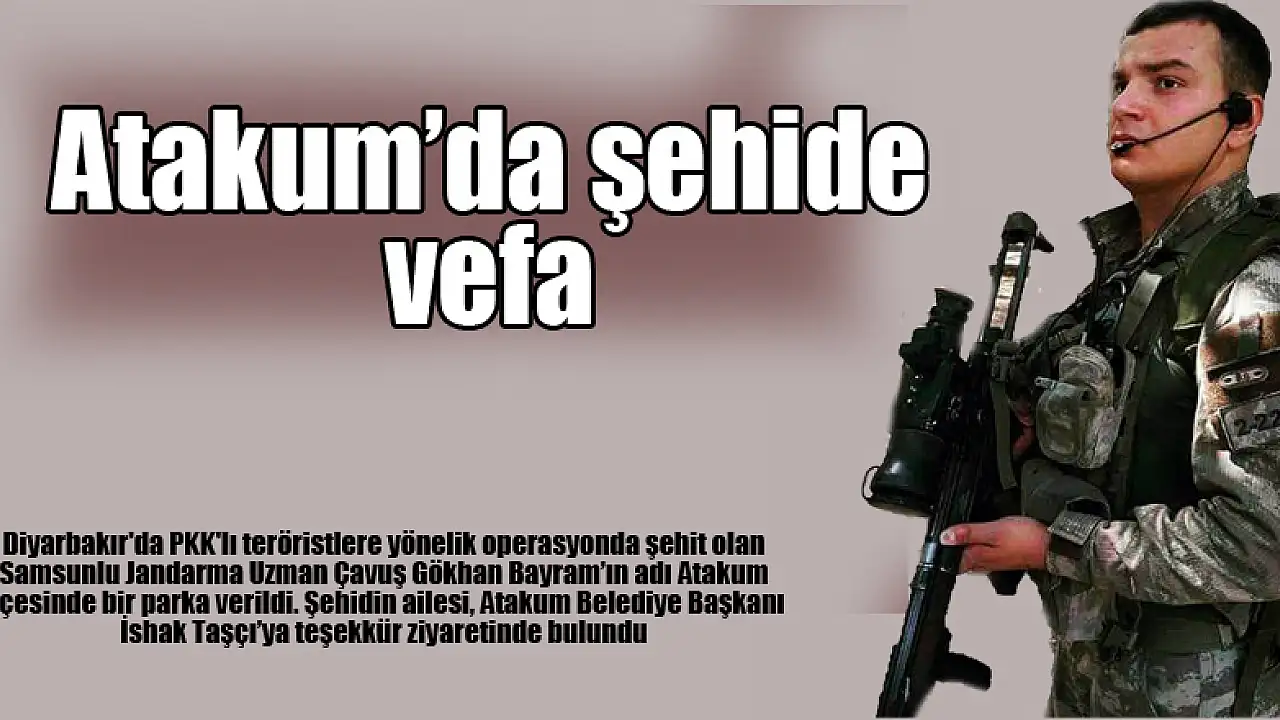 Diyarbakır'da PKK'lı teröristlere yönelik operasyonda şehit olan Samsunlu Jandarma Uzman Çavuş Gökhan Bayram'ın adı Atakum ilçesinde bir parka verildi. Şehidin ailesi, Atakum Belediye Başkanı İshak Taşçı'ya teşekkür ziyaretinde bulundu