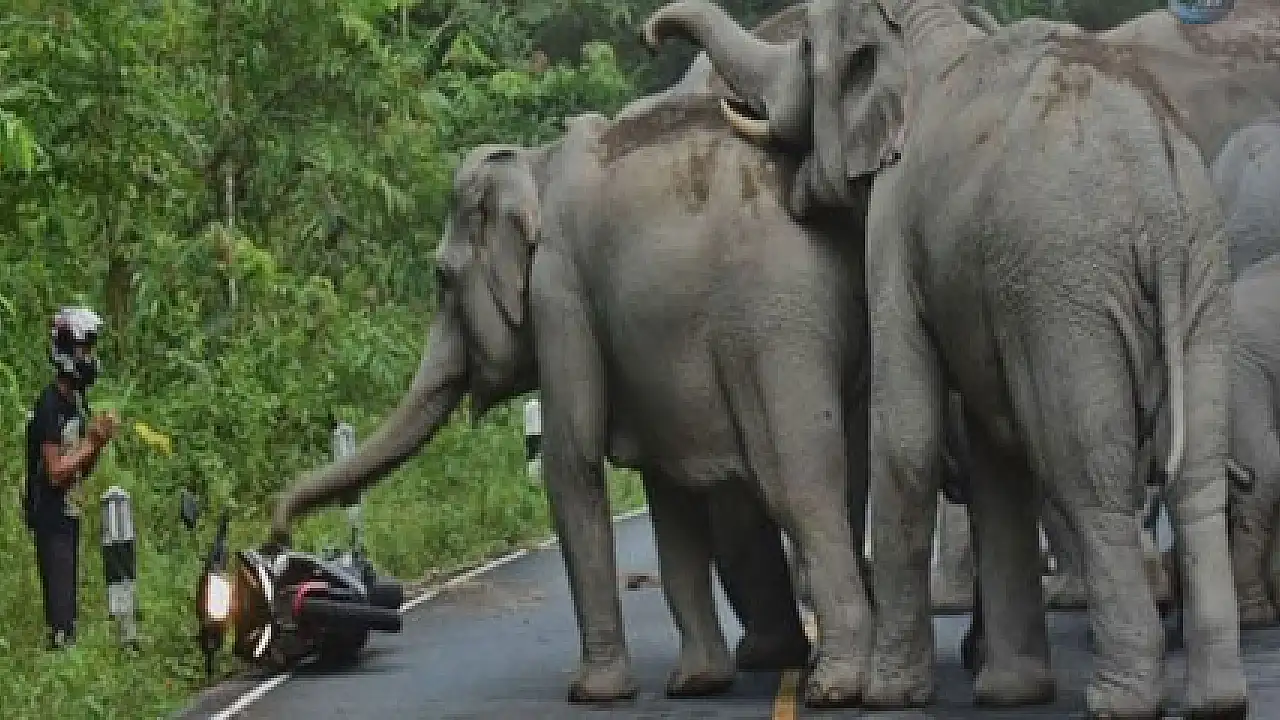 Tayland'da Khao Yai Ulusal Parkı'ndaki fil sürüsü yoldan geçen bir motosikletlinin üzerine yürüdü. Korkudan motosikletinden inen sürücü fillerin öfkesi karşısında çareyi dua etmekte buldu.