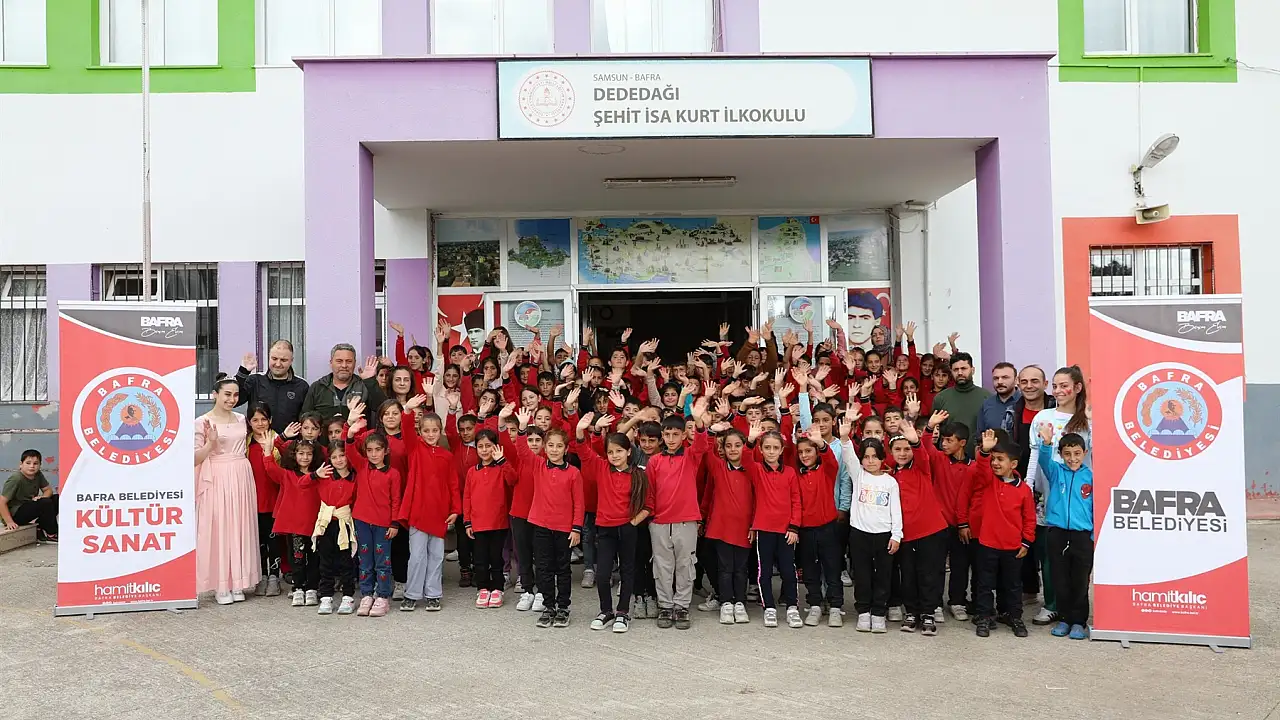 Bafra Belediyesi yetkilileri, sahnelenen tiyatro eserinin ardınan Üçpınar İlkokulu ve Dededağı Şehit İsa Kurt İlkokulu öğrencilerine çeşitli ikramlarda bulundu.