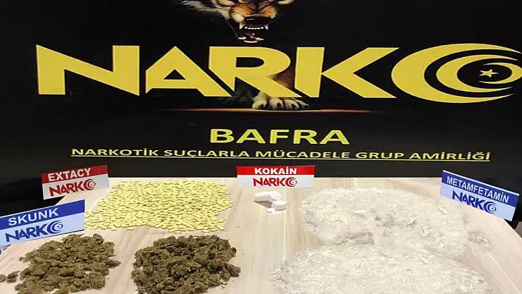 Samsun Narkotik Suçlarla Mücadele Şube Müdürlüğü ve Bafra Narkotik Suçlarla Mücadele Grup Amirliği ekiplerince yapılan çalışmalar sonucunda takibe alınan araçta yapılan aramada 2 paket halinde 1 kilogram metamfetamin, 594 adet ecstasy hap,155.14 gram skunk ve 39.41 gram kokain ele geçirildi. Olayla ilgili S.A. ve M.G. isimli şahıslar gözaltına alındı.