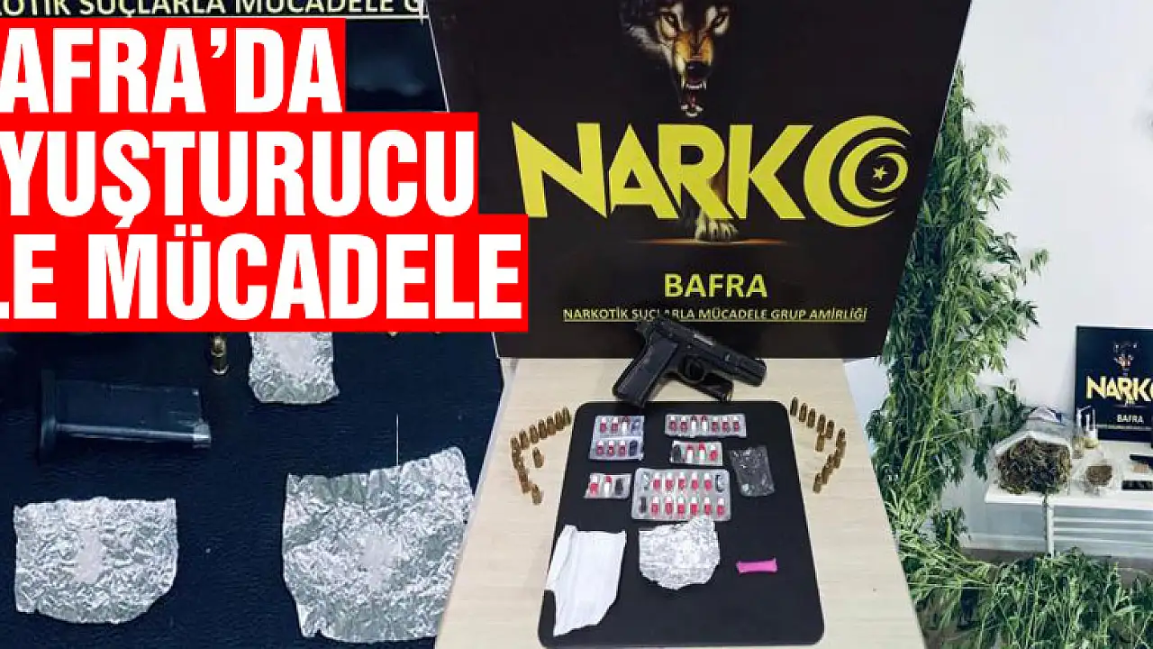 Bafra İlçe Emniyet Müdürlüğü ekiplerinin uyuşturucu ile mücadele kapsamında yaptığı operasyonlarda 1059 gram esrar, 137.7 gram bonzai, 119 adet Hint keneviri, 45 adet uyuşturucu hap, 15,17 gram metamfetamin, 13 adet uyuşturucu içme aparatı, 7 adet ruhsatsız tabanca ve tabancalara ait çok sayıda mermi ele geçirdi. Ele geçirilen uyuşturucu ve ruhsatsız silahlarla ilgili 22 kişiye adli işlem yapıldı.