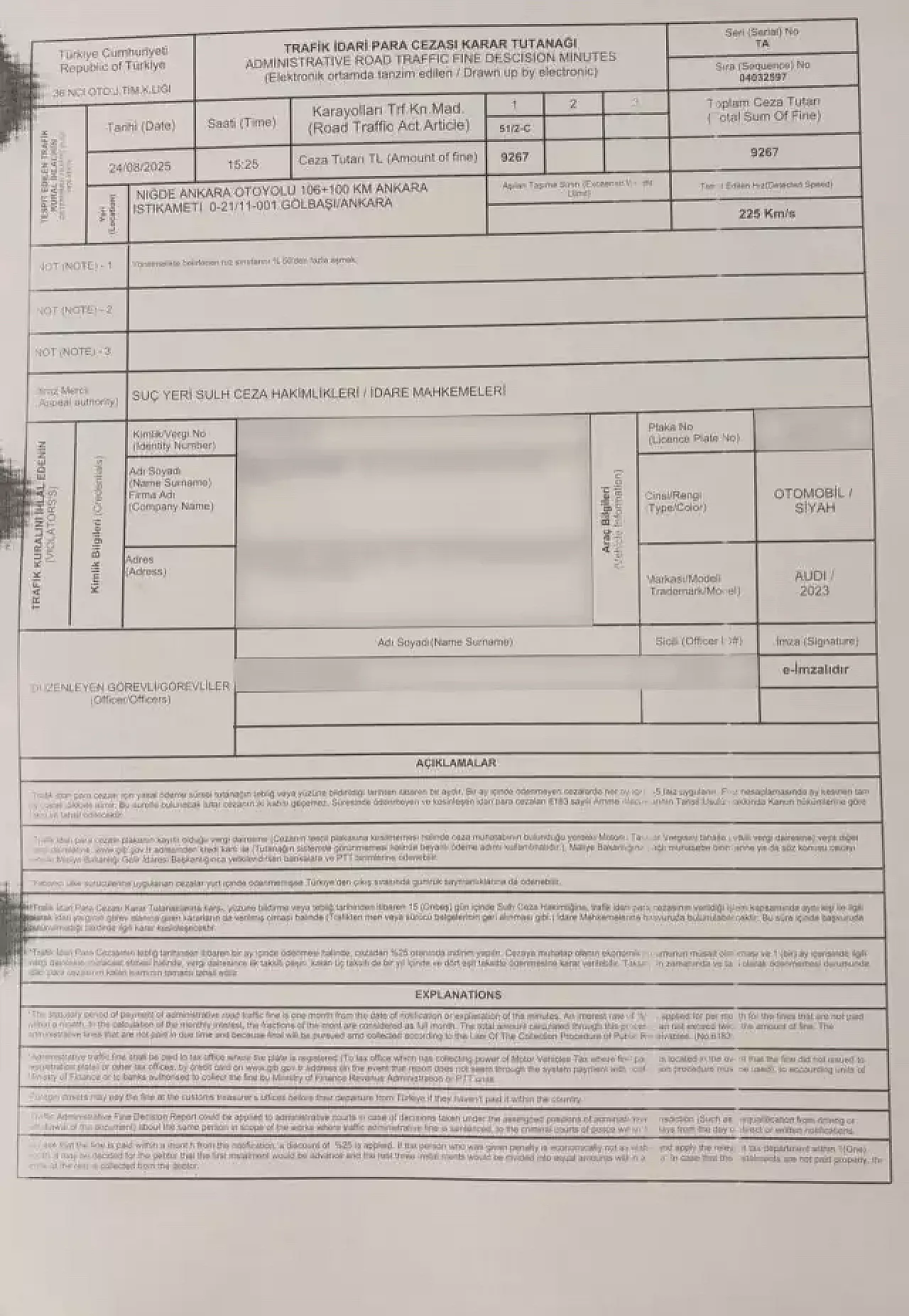 Ulaştırma Ve Altyapı Bakanı Abdulkadir Uraloğlu, kendine ait sosyal medya hesabından, Ankara-Niğde Otoyolu'nda otomobilin direksiyonuna geçtiği esnada hız sınırını geçtiğini duyurarak, jandarma tarafından kesilen ceza tutanağını da kamuoyuyla paylaştı.