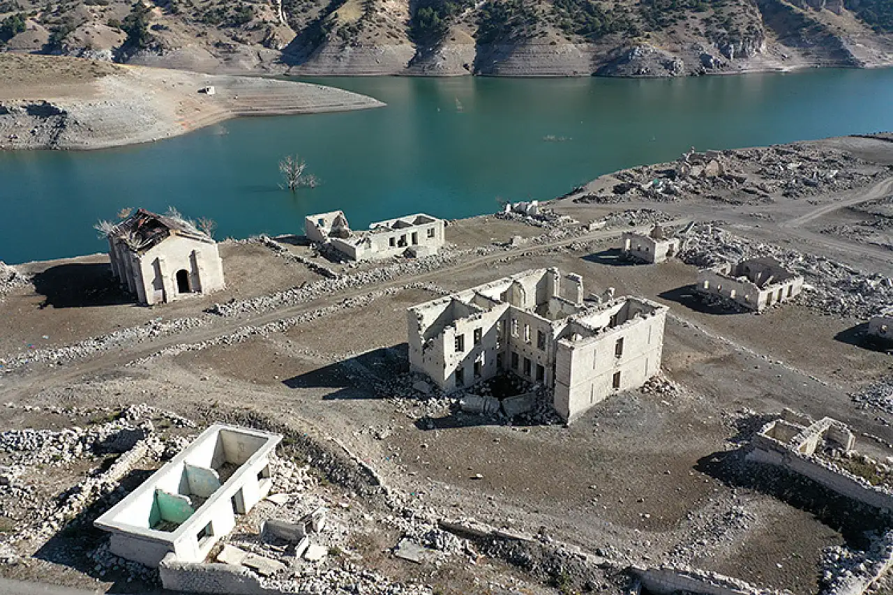 Baraj kapaklarının kısmen açılmasıyla su seviyesi düştü ve köye ait evler, cami, kilise ve tarihi binaların kalıntıları yeniden görünür hale geldi. Su çekildikçe adeta geçmişe açılan bir pencere oluştu.