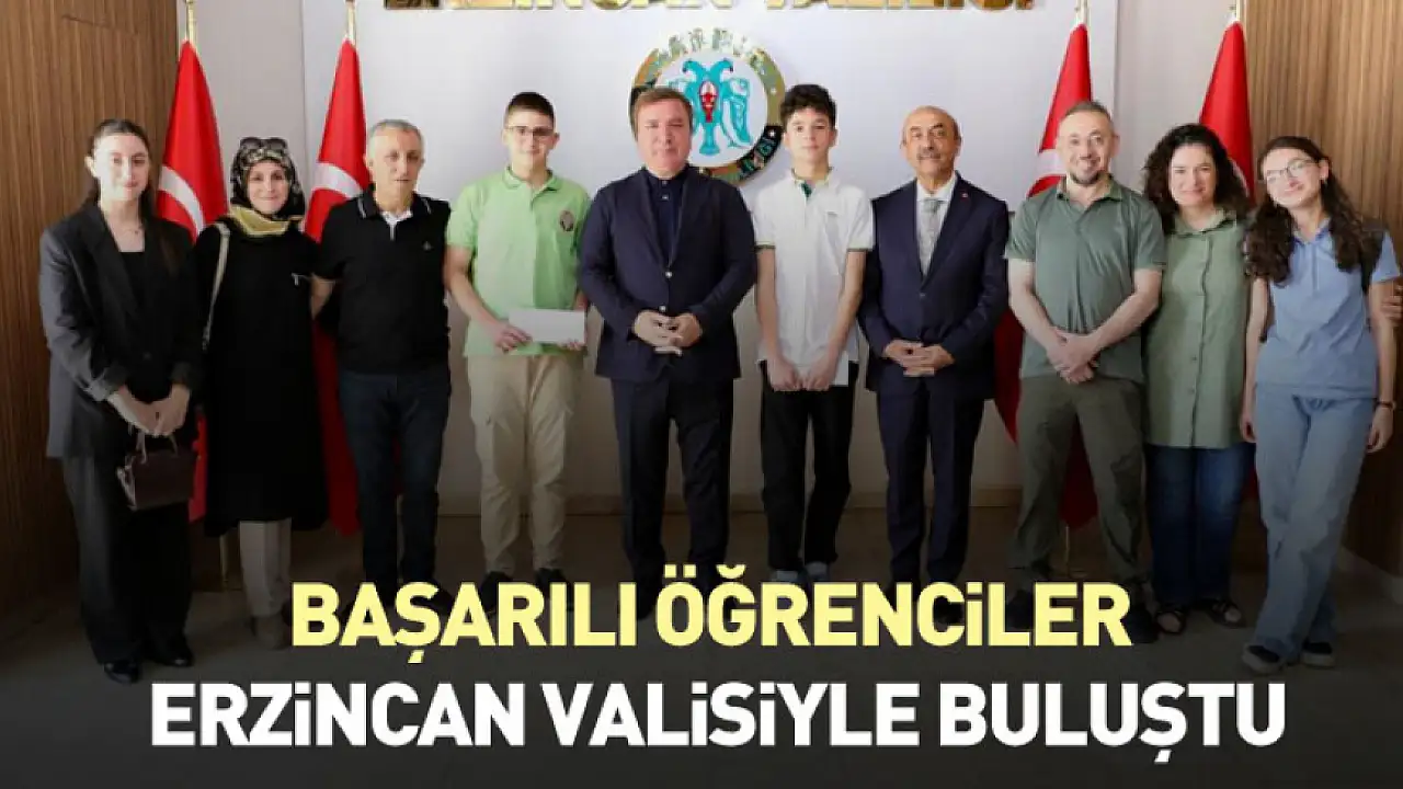 Erzincan Valisi Hamza Aydoğdu İl Milli Eğitim Müdürü Hacı Ömer Kartal'ı, 2025 LGS'de tüm soruları doğru yanıtlayarak 500 tam puanla Türkiye birincisi olan öğrenciler Mustafa Selim Kağan ve Kaan Ölmez'i, ailelerini ve okul yöneticilerini makamında kabul etti.