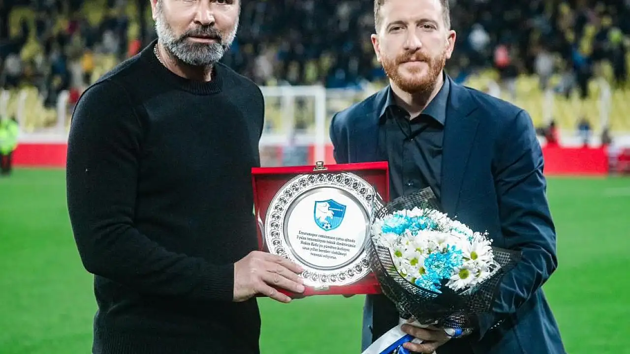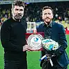 Erzurumspor FK Başkanı Ahmet Dal, kulüpte üçüncü yılını tamamlayan Teknik Direktör Hakan Kutlu'ya plaket verdi.