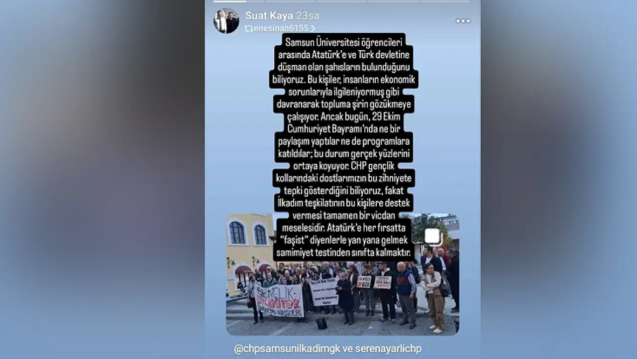 Zafer Partisi İlkadım Gençlik Kolları Başkanı Suat Kaya, “Samsun Üniversitesi öğrencileri arasında Atatürk’e ve Türk devletine düşman olan şahısların bulunduğunu biliyoruz. Bu kişiler, insanların ekonomik sorunlarıyla ilgileniyormuş gibi davranarak topluma şirin gözükmeye çalışıyor. Ancak 29 Ekim Cumhuriyet Bayramı’nda ne bir paylaşım yaptılar ne de programlara katıldılar. Bu durum gerçek yüzlerini ortaya koyuyor.” ifadelerini kullanarak sözlerine şöyle devam etti.