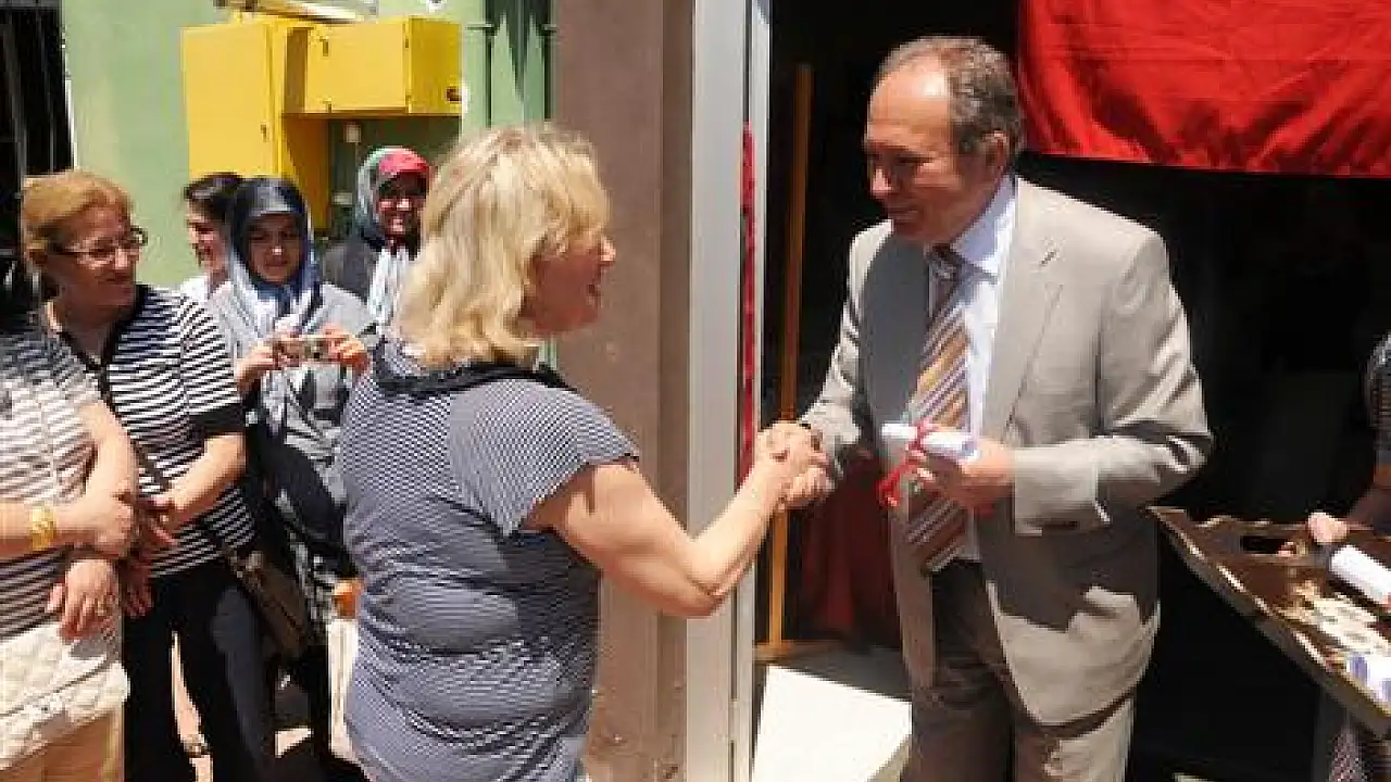 Serginin açılışını yapan Başkan Burma'ya kursiyerler el emekleri ile yaptıkları tepsi hediye ederken, Başkan Burma, kursiyerlerin katılım sertifikalarını dağıttı.