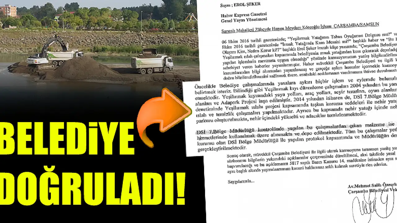 06 Ekim 2016 tarihli gazetenizde; “Yeşilırmak Yatağının Taban Oyuğunun Dolgusu mu?” ve 10 Ekim 2016 tarihli gazetenizde “Irmak Yatağında Kum Mesaisi mi?” başlıklı haber ve “Bu Kum Olayını Kim, Neden Korur ki!?” başlıklı Erol Şeker imzalı köşe yazısında; “Çarşamba Belediyesinin Yeşilırmak ıslah çalışmaları kapsamında belediyenin ırmak yatağından kum çıkararak depoladığı ve yapılan işlemlerin mevzuata uygun olmadığı” yönünde kamuoyununun yanlış bilgilendirilmesine sebebiyet veren haberler yayımlanmıştır. Haber müvekkil Çarşamba Belediyesi ve ilgili kamu kurumlarından bilgi alınmadan yayımlanmış ve gerçeğe aykırı hususlar içermekle kamuoyunun doğru bilgilendirilmesini sağlamak üzere, aşağıdaki açıklamanın yapılmasına ihtiyaç duyulmuştur: