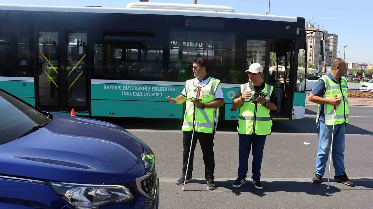 Kayseri'de trafik polisleri ile beraber trafik denetimine katılan görme engelli vatandaşlar, beyaz bastona dikkat çekti.