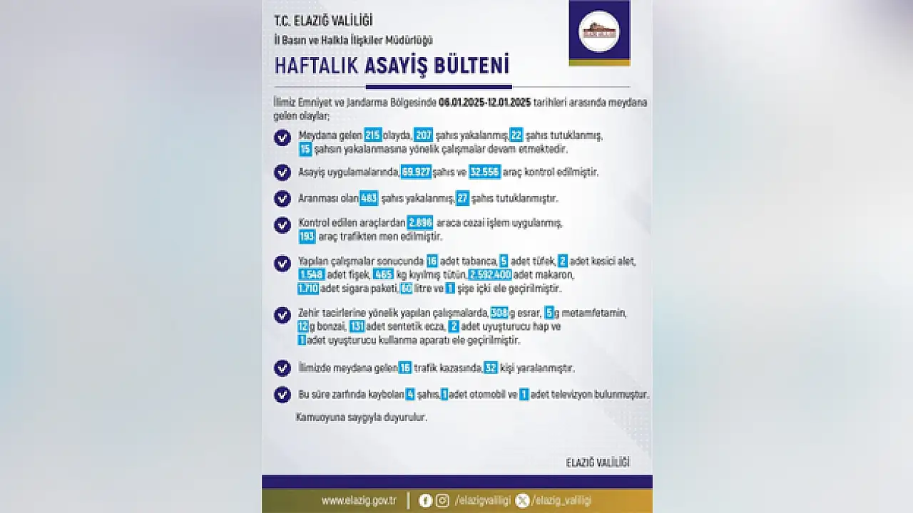 Elazığ Valiliği 6-12 Ocak arasında meydana gelen olaylar ve verileri paylaştı Buna göre Meydana gelen 215 olayda 207 şahıs yakalanırken 22’sinin tutuklandığı 15 şahsın yakalanmasına yönelik çalışmaların devam ettiği kaydedildi. 69 bin 927 şahıs ve 32 bin 556 araç kontrol edilirken aranması olan 483 şahıs yakalandı, 21’i tutuklanarak cezaevine gönderildi. Kontrol edilen araçlardan 2 bin 896’sına cezai işlem uygulanırken 93 araç trafikten men edildi. Yapılan çalışmalar sonucunda 16 adet tabanca, 5 adet tüfek, bin 548 adet fişek, 465 kilo kıyılmış tütün, 2 milyon 592 bin 400 adet makaron, bin 710 adet sigara paketi, 60 litre ve 1 sise içki ele geçirildi.