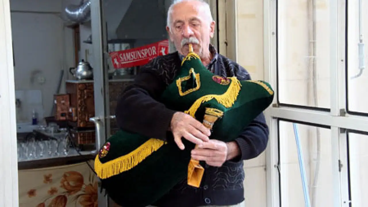 Samsun'da çay ocağı işleten 69 yaşındaki Hasan Özbek, müşterilerine tulum eşliğinde çay ikram ediyor.
