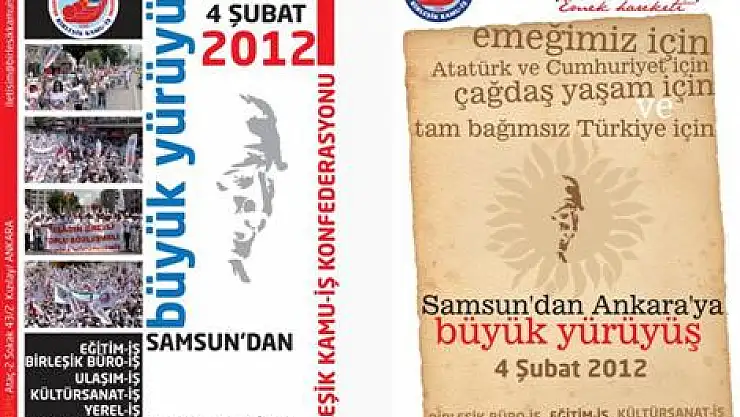 Samsun’ dan Ankara’ya yürüyüşe başlayan Birleşik Kamu-İş Konfederasyonu Üyeleri yürüyüş öncesinde Samsun Cumhuriyet Meydanında bir basın açıklamasında bulundu. Basın açıklamasını Birleşik Kamu-İş Konfederasyonu Genel Başkanı İsmail Tutoğlu yaptı. Tutoğlu yaptığı açıklamada, “Bir kaç haftadır tüm yurdu kaplayan beyaz kar örtüsü, keşke bu güne kadar yaşanan yokluk, yoksulluk, açlık, işsizlik, hukuksuzlukların da üstünü böylesine örtebilse, tüm ulusumuz, insan haklarına saygılı, sosyal bir hukuk devletinde, içerde ve dışarıda, barış ortamında, kalkınmış, temel sorunlarını çözmüş, demokratik kurum ve kurallarını yerleştirmiş, üreten, hakça bölüşen, gelecek kuşakların refahını güvenceye almış bir ülkede huzur içinde yaşayabilse...” cümleleri ile konuşmasına başladı.