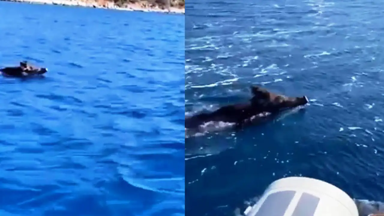 Muğla'nın Bodrum ilçesinde denizde yüzen domuz görenleri şok etti. Yüzerek kıyıdan kıyıya geçen domuz cep telefonu kamerasına yansıdı