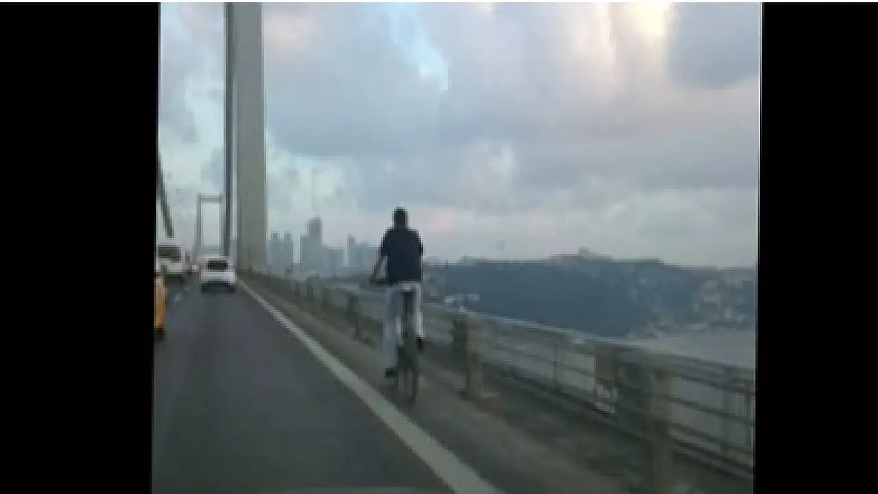 Sabah saatlerinde bisikletiyle Boğaziçi Köprüsü üzerinde seyahat eden bir kişi amatör kamera tarafından görüntülendi. Motorsuz taşıt kullanımının yasak olduğu köprü üzerinde bisiklet kullanan sürücü olası bir kazaya davetiye çıkardı.