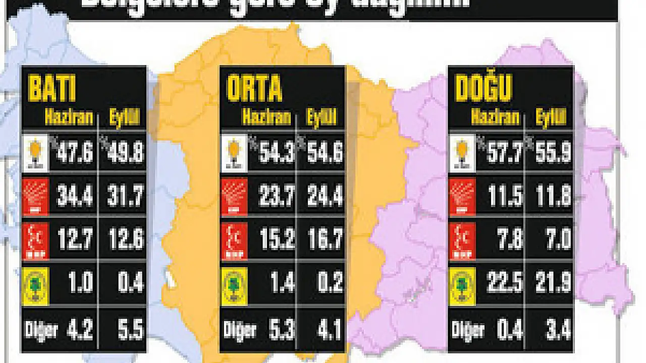 Bilal Günal'ın haberine göre, partilerin oyllarının bölgelere dağılımında dikkat çekici sonuçlar çıktı. CHP batı bölgelerinde kan kaybetmeye başladı.