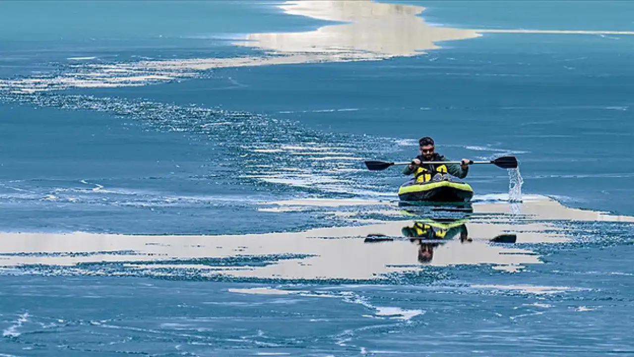 Van'da sporseverler, Zernek Baraj Gölü'nde buz kütleleri arasında kano yaptı.