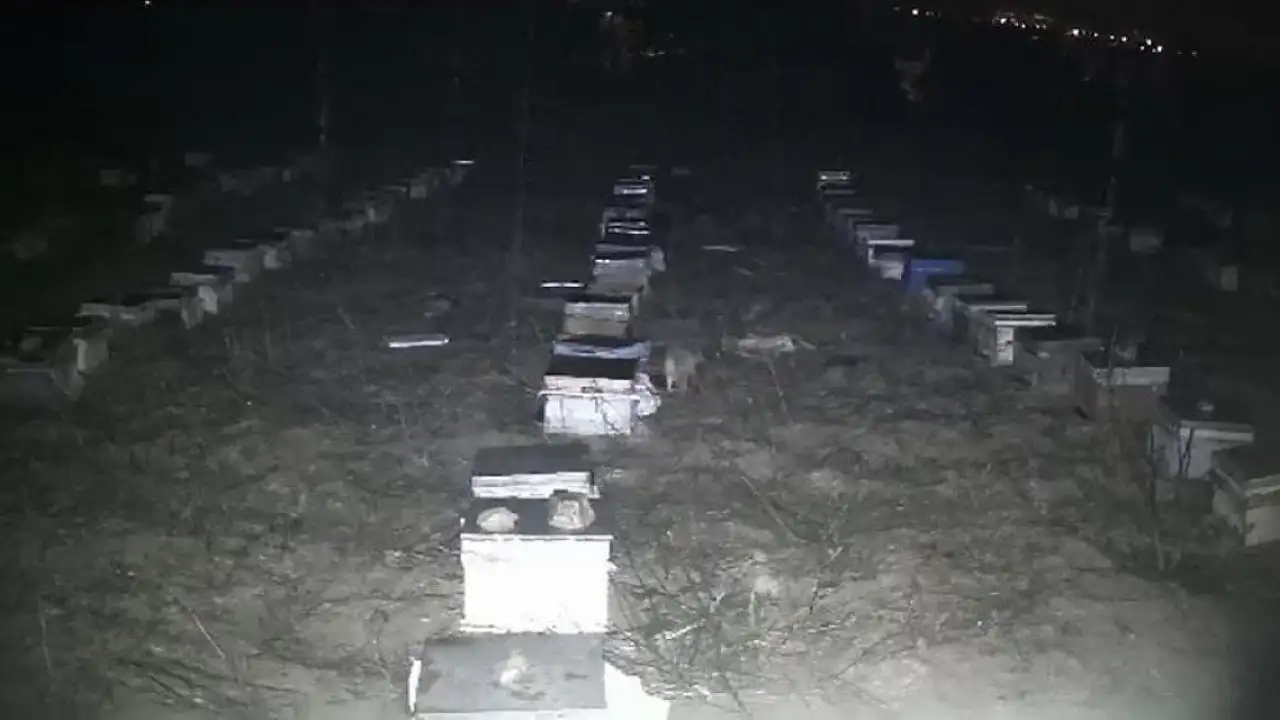 Tokat'ta bir arıcının bahçesine giren çakallar arı kovanlarında bulunan balları yiyerek içinde bulunan arıları telef etti. O anlar güvenlik kamerasına yansıdı.