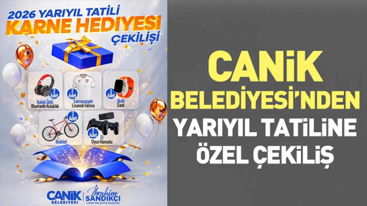 Yarıyıl tatiline özel Karne Hediyesi Çekilişi gerçekleştiren Canik Belediyesi, öğrencilerin karne sevincine ortak oluyor. 26 Ocak 2026 tarihine kadar başvuruların gerçekleştirilebileceği Karne Hediyesi Çekilişi'yle 2 adet Samsunspor Lisanslı Forma, 2 adet bisiklet, 2 adet kulak üstü bluetooth kulaklık, 2 adet akıllı saat ve 2 adet el oyun konsolu sahibini bulacak. Çekilişin sonuçları 27 Ocak 2026 tarihinde açıklanacak.