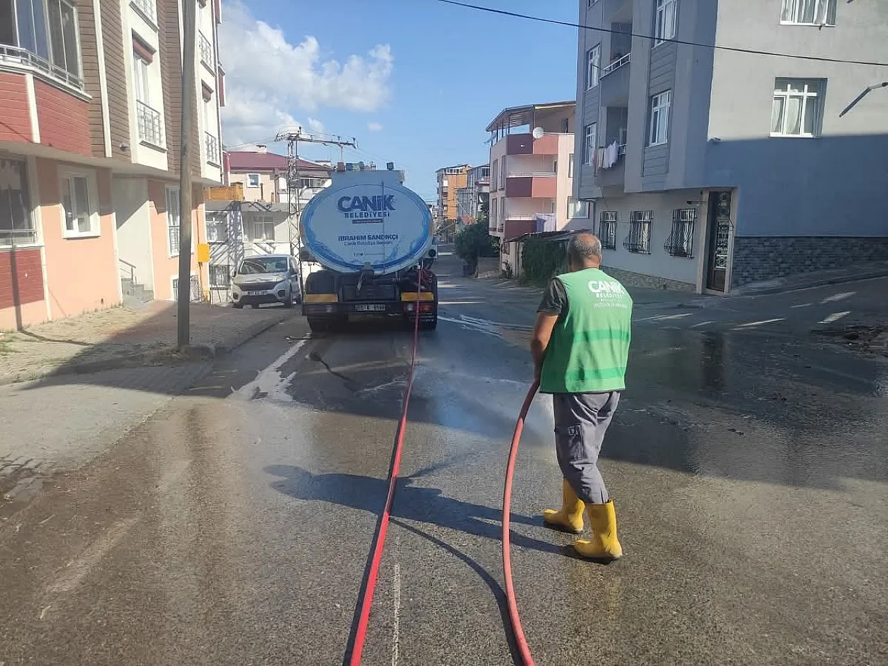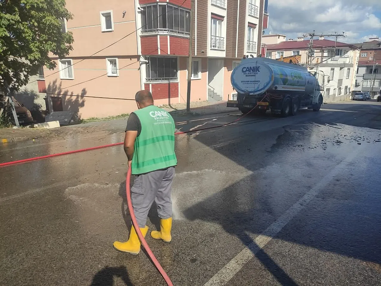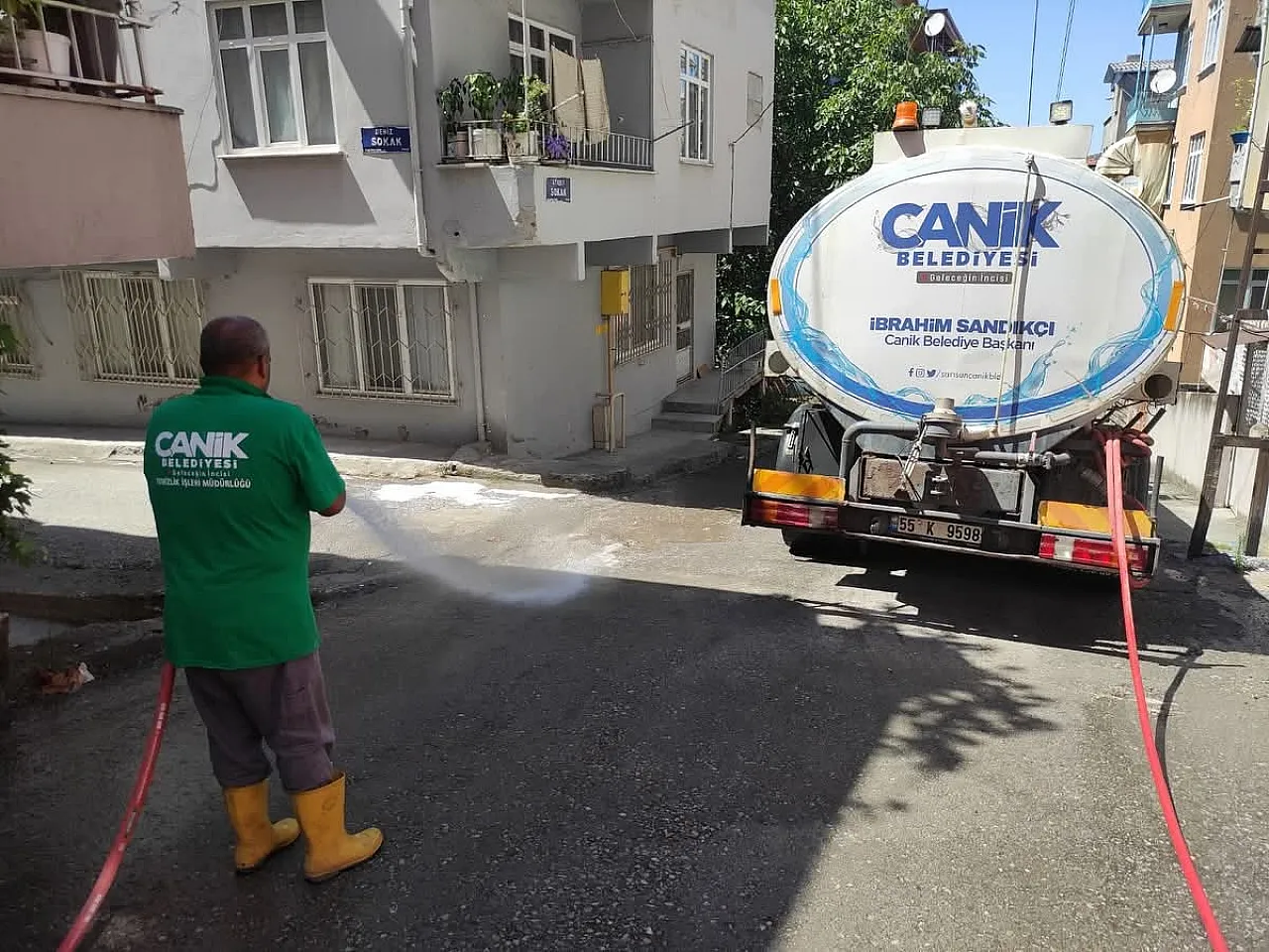Canik Belediyesi, yaz aylarının gelmesiyle birlikte ilçe genelinde kapsamlı bir temizlik çalışması başlattı. Cadde ve sokaklar özel ekipmanlarla yıkanırken, belediye ekipleri hijyenin sağlanması için sahada yoğun mesai harcıyor.