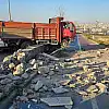 Çarpışma sonrası kamyon duvarın üzerinde askıda kaldı
