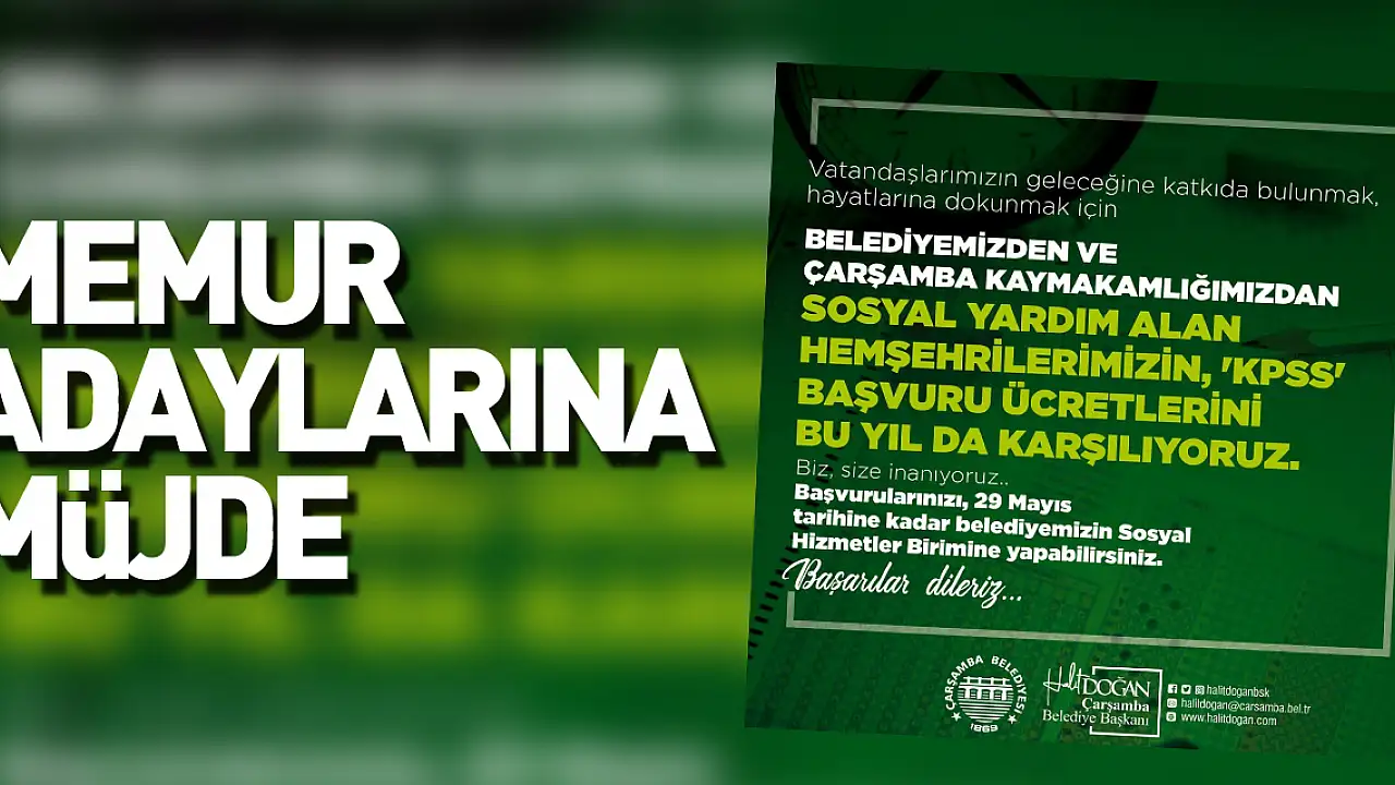 Eğitime yapılan yatırımın geleceğe yapılan değerli bir yatırım olduğunu vurgulayan Çarşamba Belediye Başkanı Halit Doğan, “Her alanda öncü kent; eğitime ve öğrencilere verilen destekle olunur. Biz bunun bilincinde olarak Çarşamba Belediyesi olarak hayata geçirdiğimiz her türlü projede gençlerimizin, hemşehrilerimizin hayatlarına dokunabilmeyi, geleceklerine katkı sunmayı hedefliyoruz. Gençlerimize inanıyor, hayatlarının her alanında onları desteklemeyi sürdürüyoruz. Vatandaşlarımızın geleceğine katkıda bulunmak, hayatlarına dokunmak için belediyemizden ve Çarşamba Kaymakamlığımızdan sosyal yardım alan hemşehrilerimizin, 'KPSS' başvuru ücretlerini bu yıl da karşılıyoruz. Hemşehrilerimiz başvurularını, 29 Mayıs tarihine kadar belediyemizin Sosyal Hizmetler Birimine yapabilirler. Belirtilen koşulları taşıyan ve başvuru ücretlerini yatırmış olan hemşehrilerimiz, ödeme makbuzu ile belediyemize başvuruda bulunabilirler. Sınava girecek tüm adaylara başarılar dilerim. Rabbim haklarında hayırlısını nasip etsin” dedi. İHA