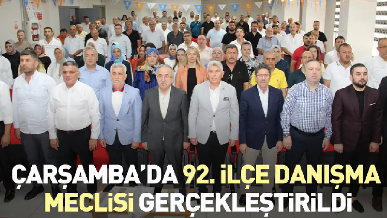 AK Parti Çarşamba Teşkilatı, 92. İlçe Danışma Meclisi Toplantısında bir araya geldi. AK Parti Çarşamba İlçe Başkanlığı tarafından düzenlenen 92. İlçe Danışma Meclisi Toplantısı, Çarşamba Öğretmenevi'nde geniş katılımla gerçekleştirildi. Toplantıda teşkilat çalışmaları değerlendirilirken, birlik, beraberlik ve istişare mesajları öne çıktı.